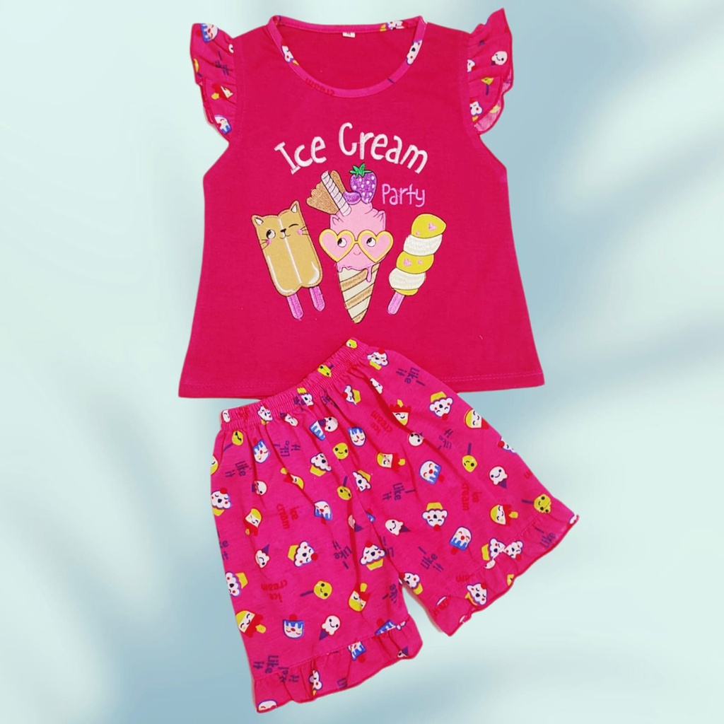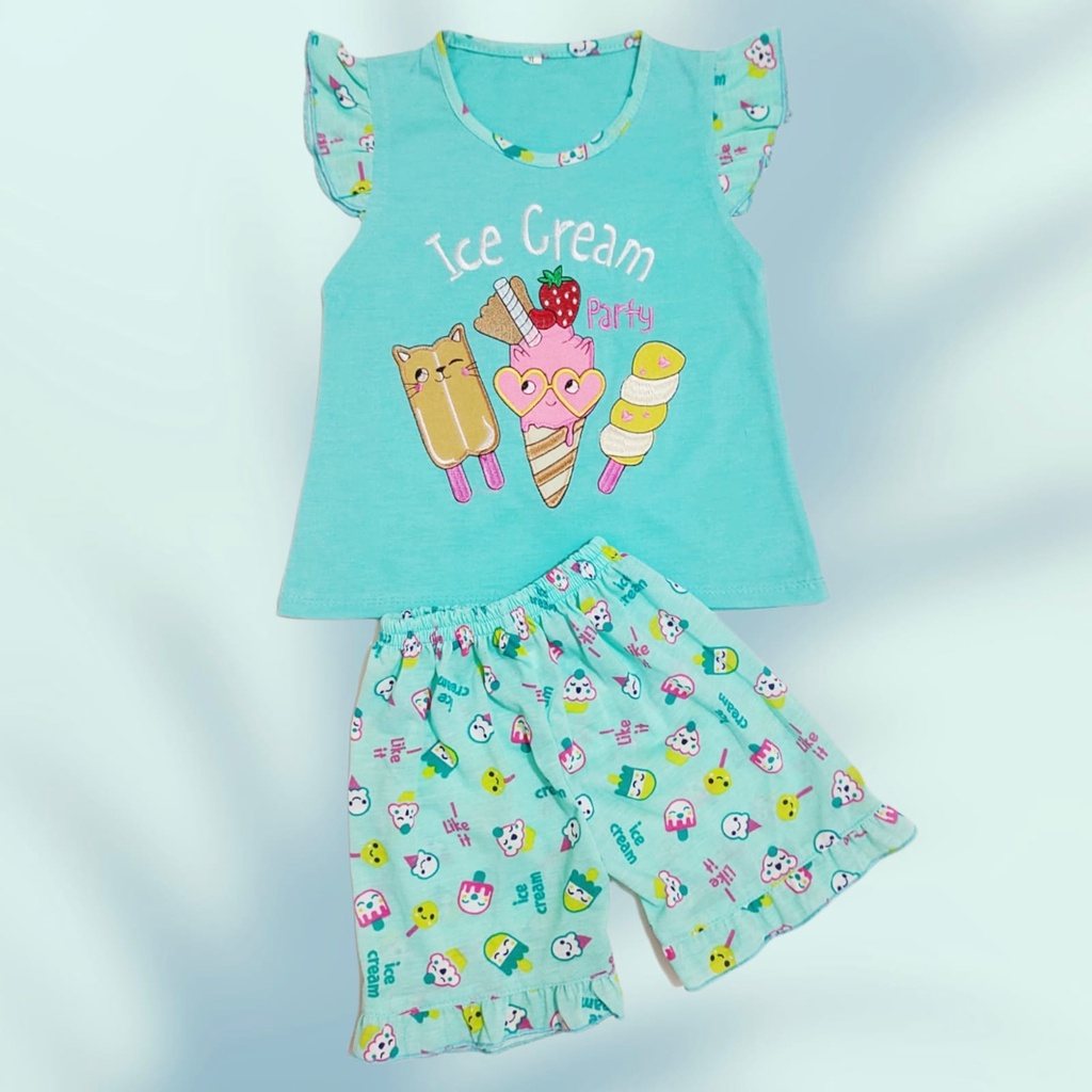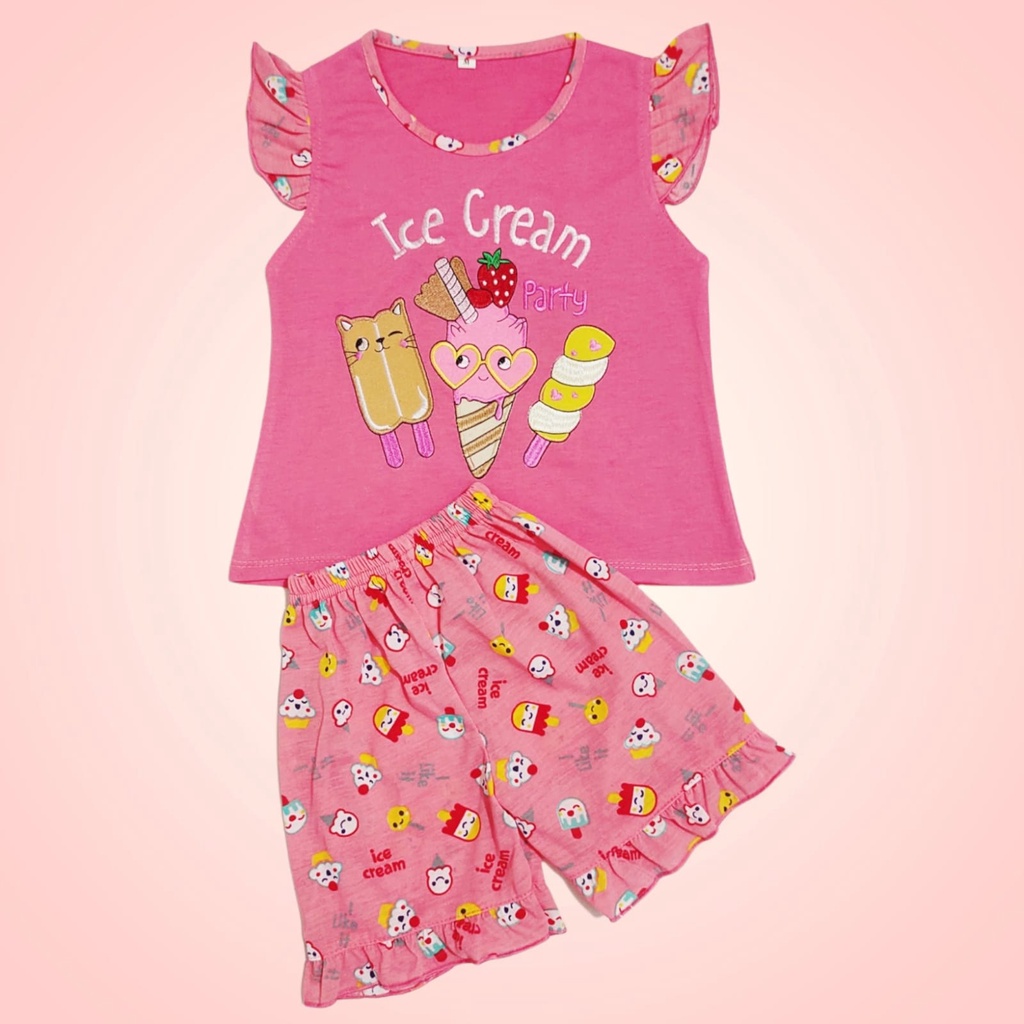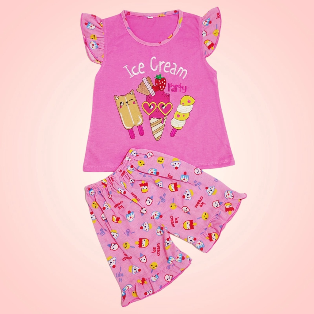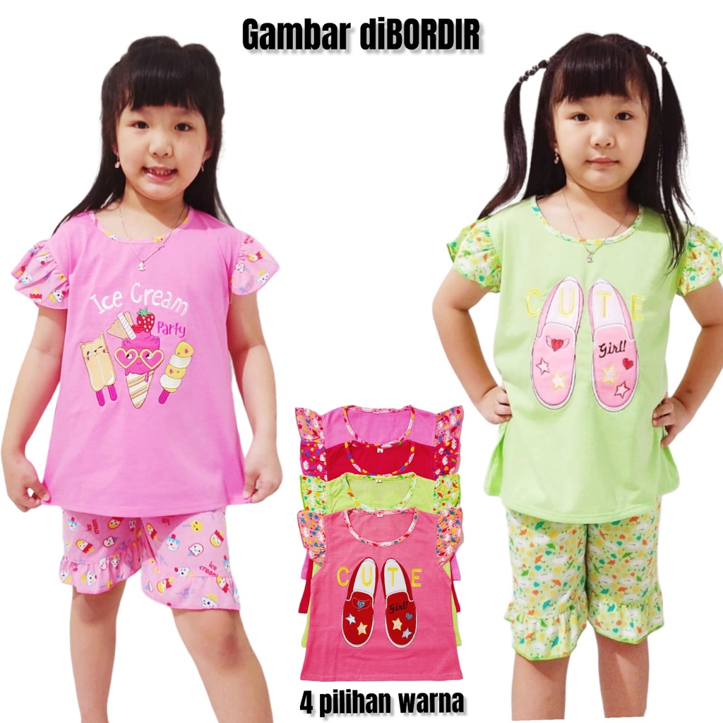 KIYOSAKI KIDS - SETELAN ANAK PEREMPUAN TANGAN MODEL RUFFLE LENGAN PENDEK CELANA PENDEK 1-9 TAHUN GAMBAR DIBORDIR MOTIF SEPATU-ICE CREAM- SETELAN HARIAN ANAK CEWEK - BAJU ANAK MURAH
