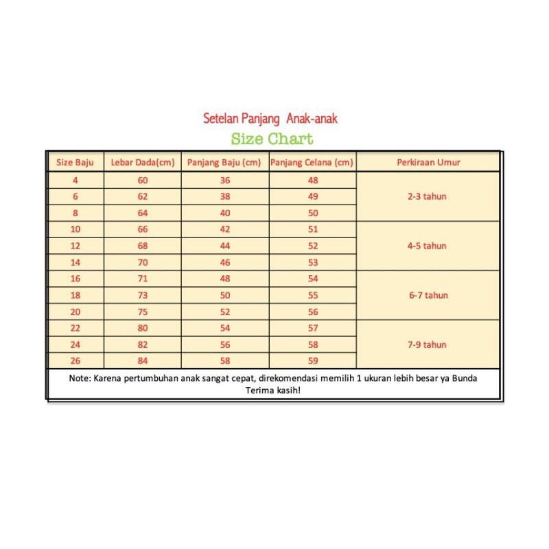 Produk ini memiliki 3 Variasi Ukuran yaitu : 2-3 taun,4-5 taun,6-7 taun,